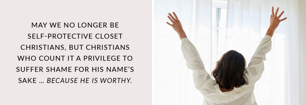 The time has come for us to choose which kind of “standing ovation” we are going to seek — the world’s, or Christ’s. Only one kind of life is truly worth living; only one kind of life is an unstoppable force for the Kingdom of God. It’s a life that boldly, audaciously, unabashedly declares, “I’m with Jesus!” and gladly embraces the reproach of Christ and the offense of the Cross. May we no longer be self-protective closet Christians, but Christians who count it a privilege to suffer shame for His Name’s sake … because He is worthy.