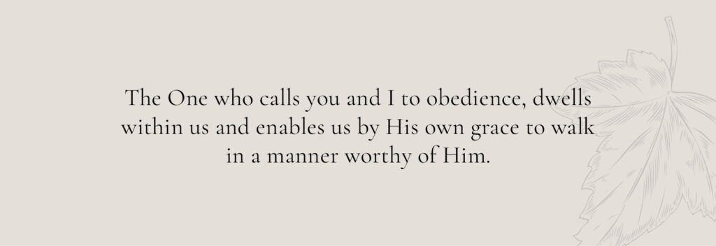 And, dear reader, a sweet promise is given — we need not walk by faith and obedience in our own strength, striving, or perfection. The One who calls you and I to obedience, dwells within us and enables us by His own grace to walk in a manner worthy of Him. Lean on your Beloved in your present trial and look to His rich Word to undergird you with the strength He longs to give you.