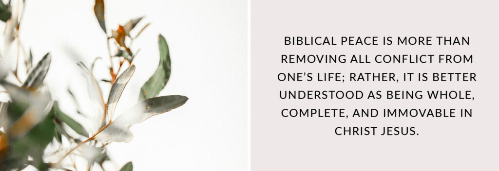 In short, biblical peace is more than removing all conflict from one’s life; rather, it is better understood as being whole, complete, and immovable in Christ Jesus. True peace isn’t found in perfect circumstances, but can be experienced amidst life’s troubles and trials. Perfect peace is ultimately found in a perfect Person.